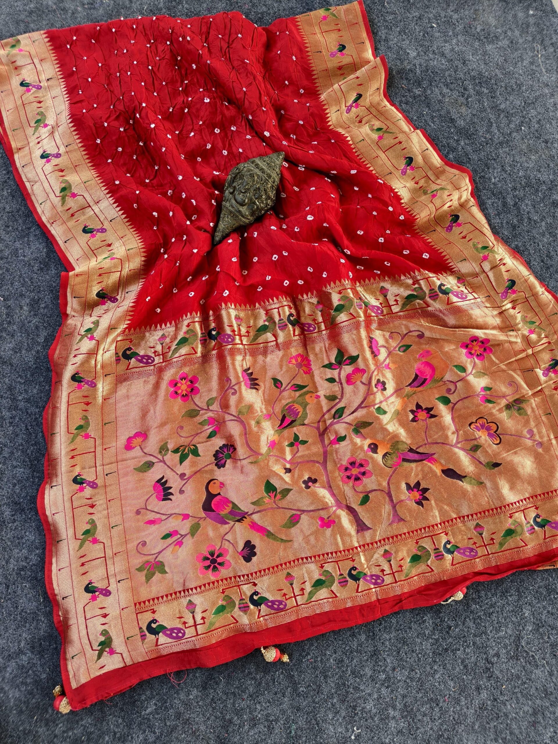 Discover our exquisite Bandhani Weaves Fusion Sarees, crafted with rich colours and elegant artistic borders. A beautiful blend of traditional charm and modern style, perfect for festive wear, celebrations, and graceful everyday elegance.