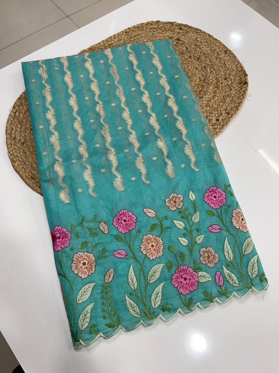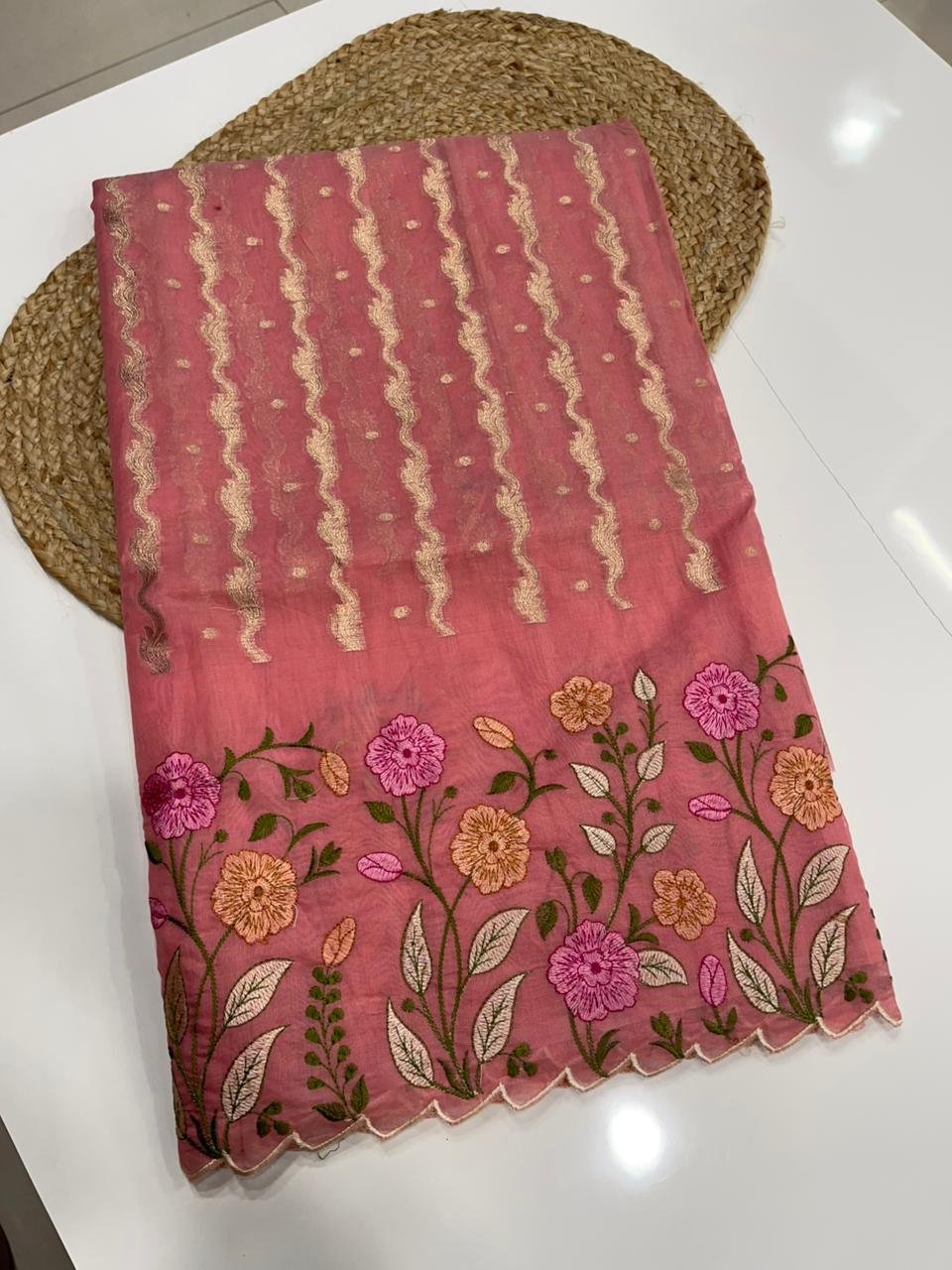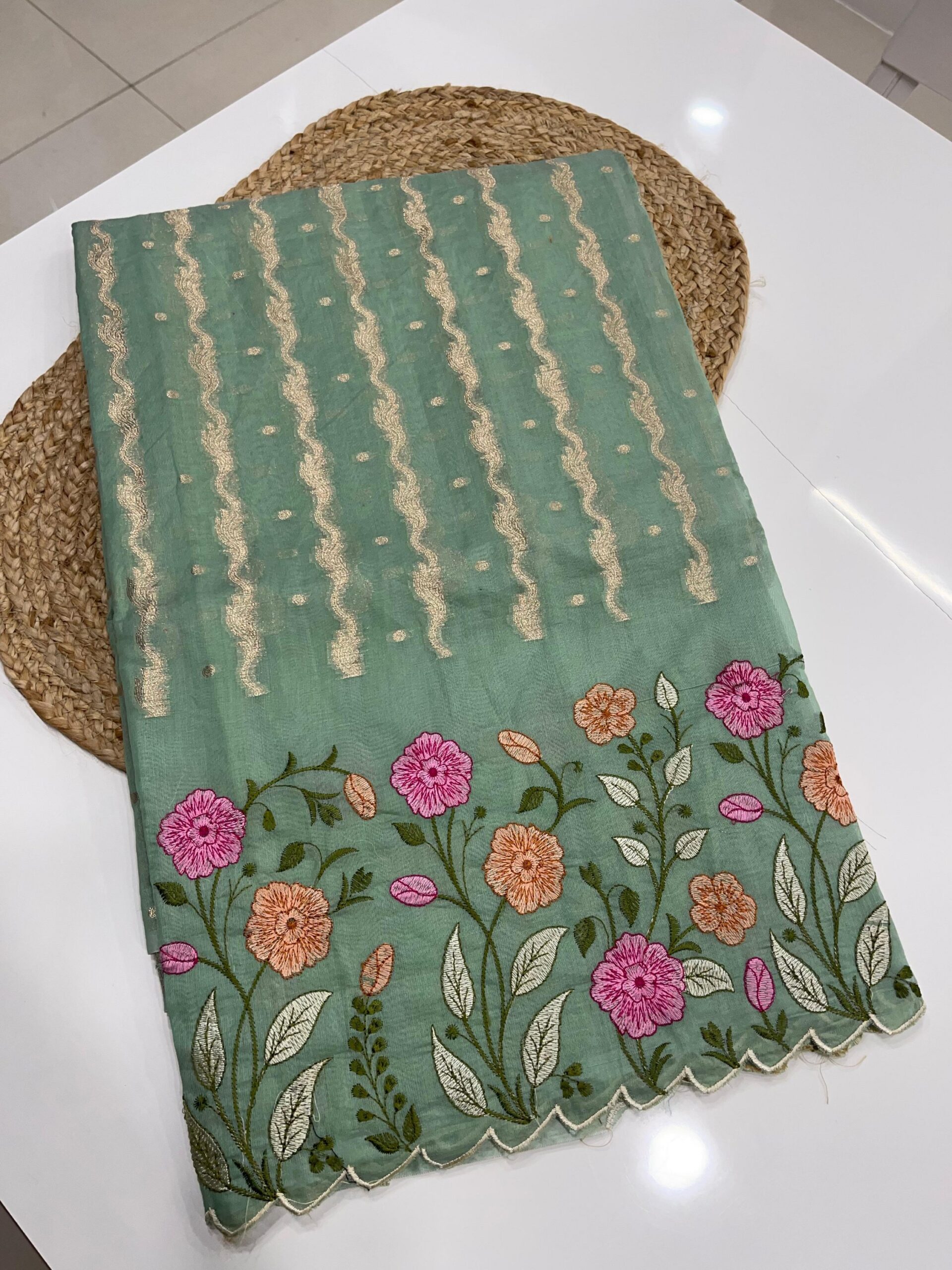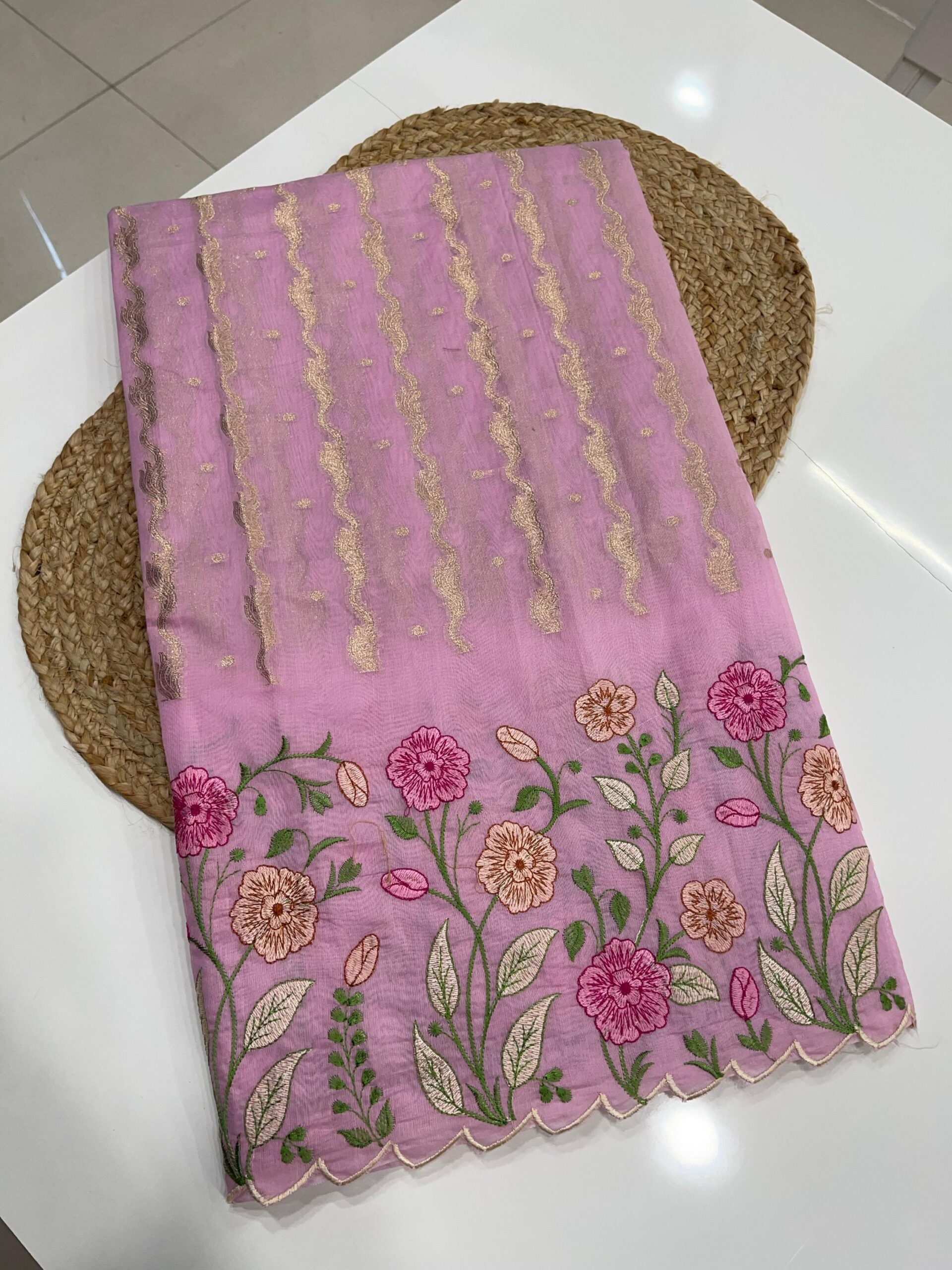 • Elegant scallop borders with full floral embroidery