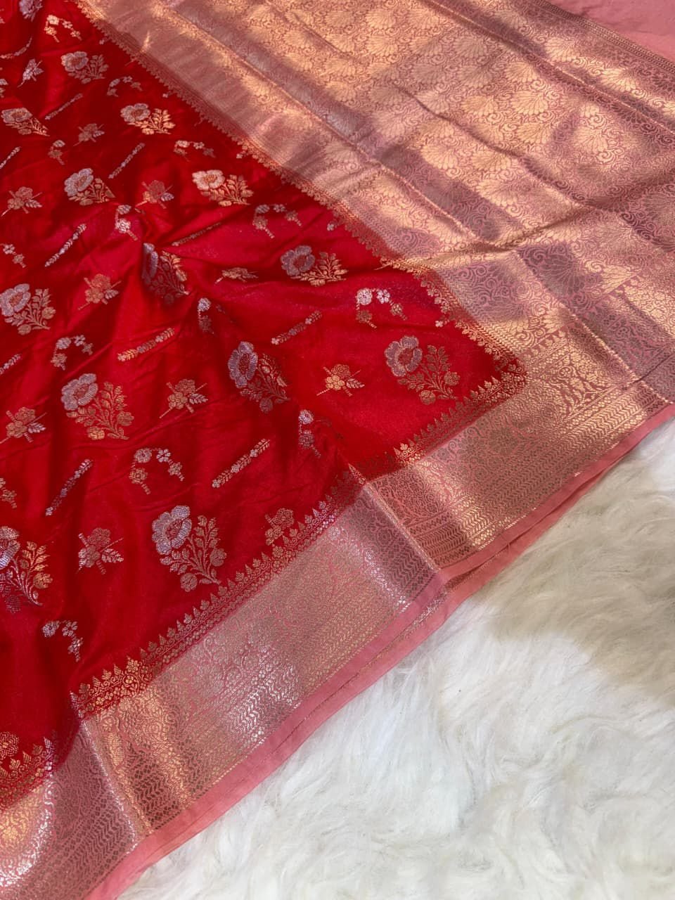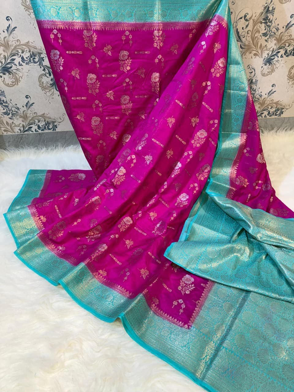 This saree features intricate meenakari weaving all over, showcasing fine craftsmanship and traditional artistry. The contrast zari Banarasi border adds a royal touch, making it perfect for festive wear, weddings, and celebrations.